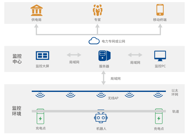 光格機器人智能巡檢系統由巡檢機器人本體、軌道系統、防火門(mén)控制系統、無(wú)線(xiàn)充電系統和通信系統組成,結合監控管理平臺,適用于電力隧道、綜合管廊、發(fā)電廠(chǎng)、配電房、大數據機房等無(wú)人值守環(huán)境下的監控場(chǎng)景。